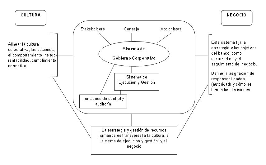 Este sistema de gobierno se establece en torno al negocio, sobre el que el gobierno corporativo hace lo siguiente: fija la estrategia y los objetivos del banco; dice cómo alcanzarlos, con qué medios; hace el seguimiento de la operatoria diaria del negocio; define responsabilidades y poderes; y establece un proceso de toma de decisiones y lo sigue.