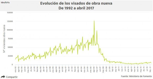 Si en el año 2006, que marcó el máximo histórico, las compraventas de vivienda ascendieron a 955.186 unidades, de las que 410.192 fueron nuevas (el 42,94%), y el número de visados de obra nueva ascendió a 865.561 viviendas, ha tenido que transcurrir una década para que en 2017 nos aproximemos a las 500.000 viviendas vendidas y a los 80.000 visados, cifras como puede verse que apenas superan el 50% de compraventas y no llegan al 10% de visados desde máximos.